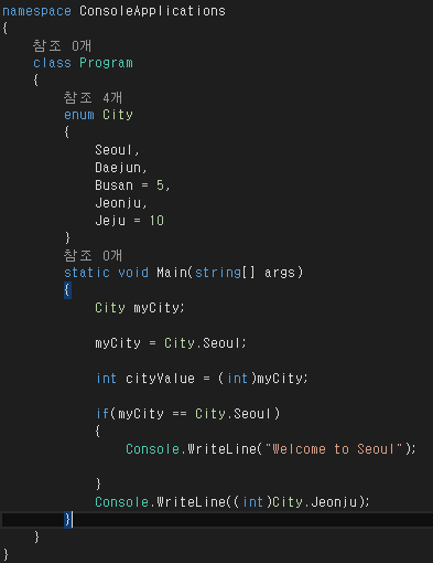 - enum의 이름으로 타입이 지정되기 때문에 int 타입으로 사용하려면 int로 타입캐스팅 해야 함