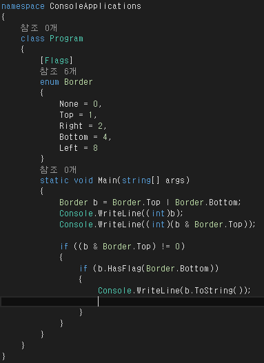 - OR 연산자로 다중 플래그 할당, AND 연산자나 HasFlag 함수로 특정 멤버를 포함하고 있는지 체크
